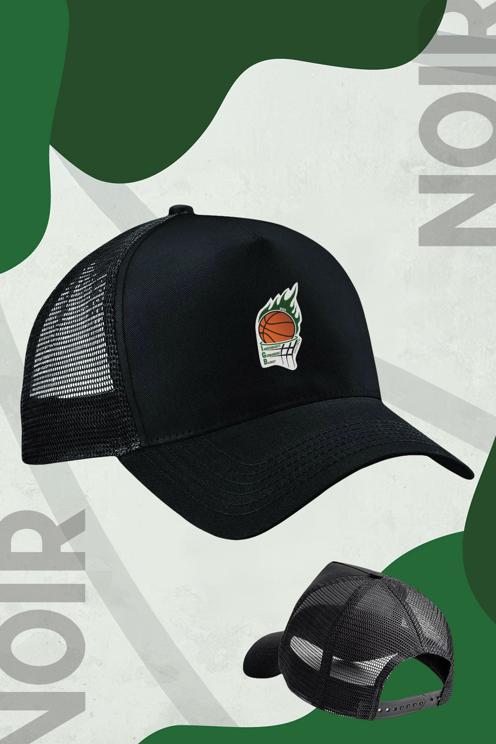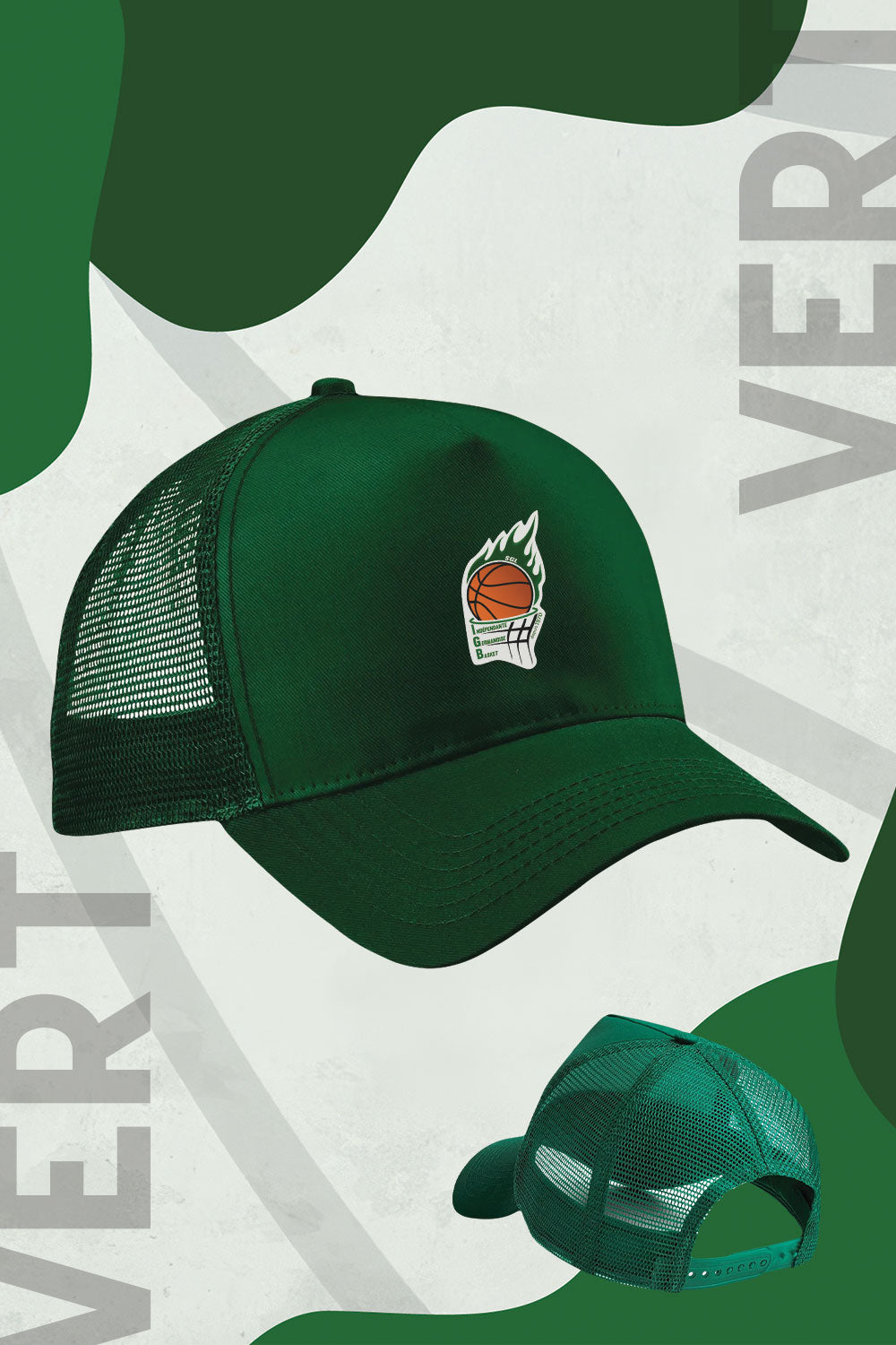Panneau avant et visière 100% Coton. Panneaux arrière en filet 100% Polyester. Taille unique (ajustable)