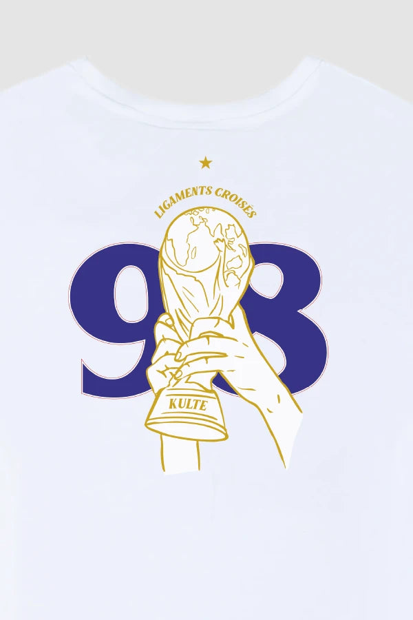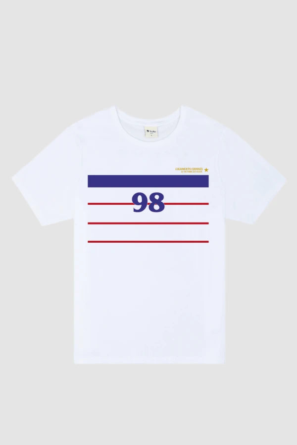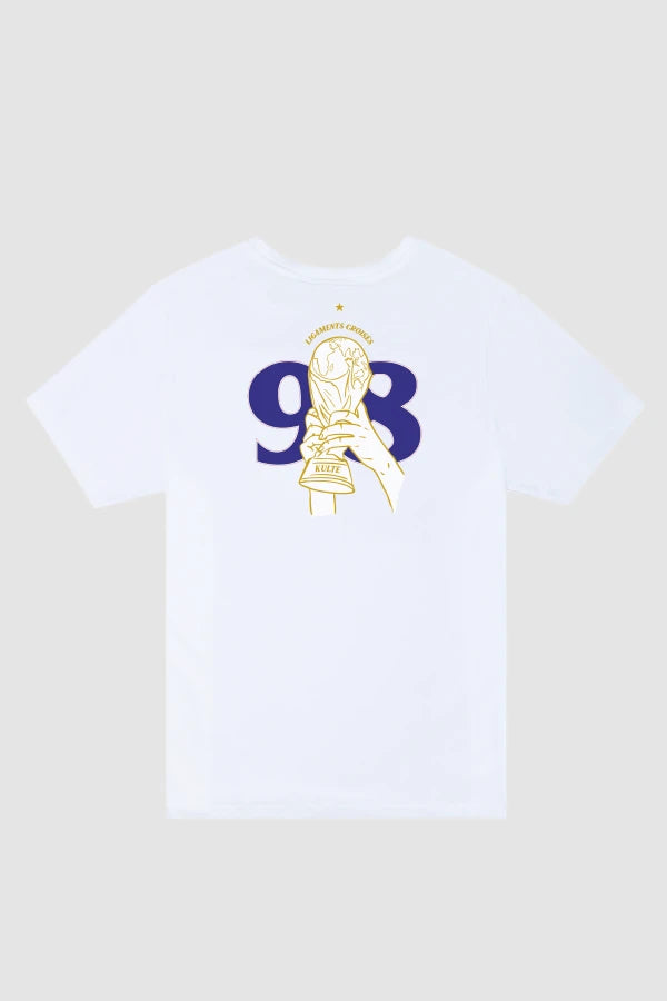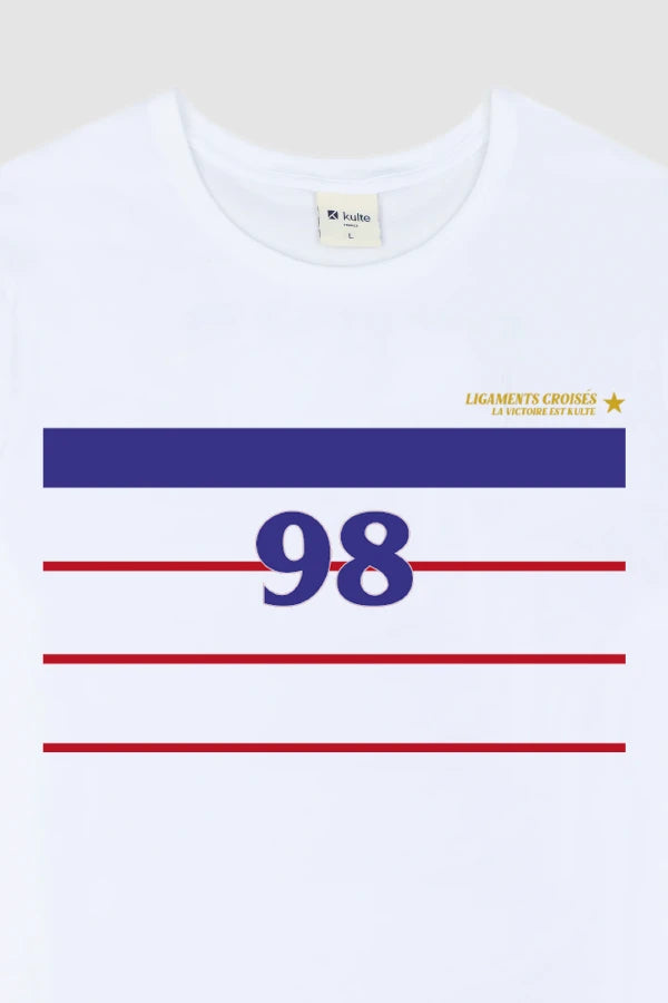 Revivez l’euphorie du 12 juillet 1998 avec ce tee-shirt blanc en coton bio, né de la collab KULTE. Son graphisme vintage mixe la date mythique et la première étoile des Bleus pour un hommage stylé, imprimé en France et limité. À enfiler pour célébrer — encore et toujours — la victoire qui a tout changé.