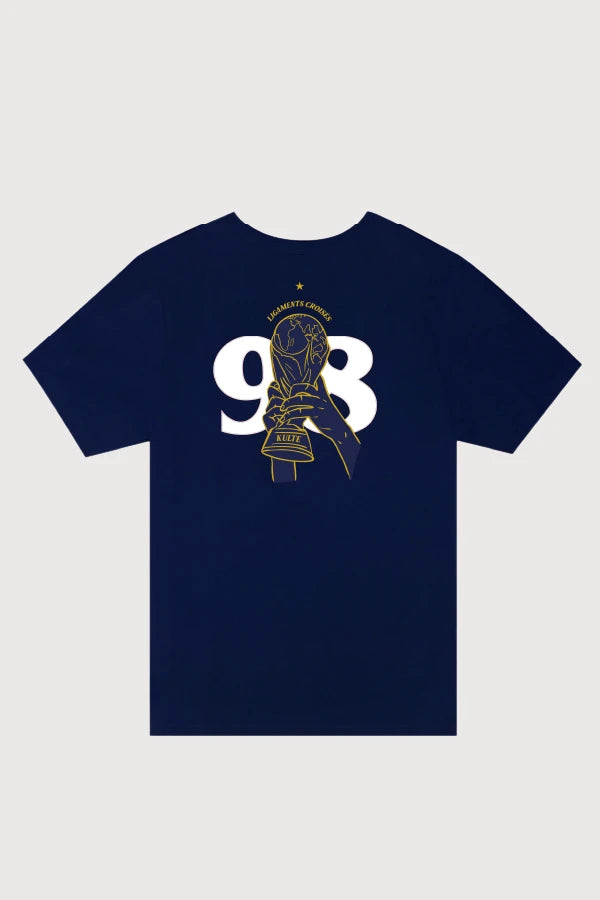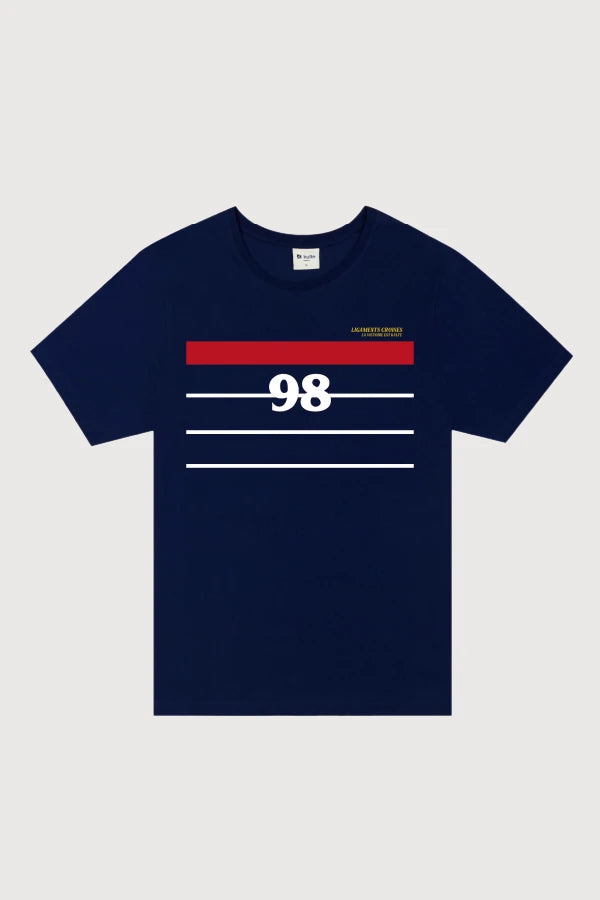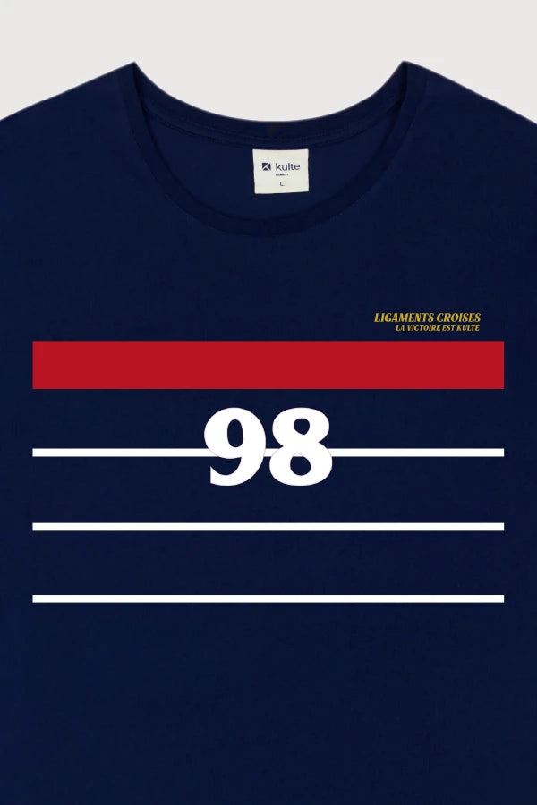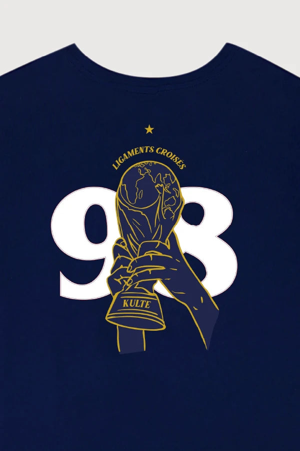 Revivez l’euphorie du 12 juillet 1998 avec ce tee-shirt bleu marine en coton bio, né de la collab KULTE. Son graphisme vintage mixe la date mythique et la première étoile des Bleus pour un hommage stylé, imprimé en France et limité. À enfiler pour célébrer — encore et toujours — la victoire qui a tout changé.
